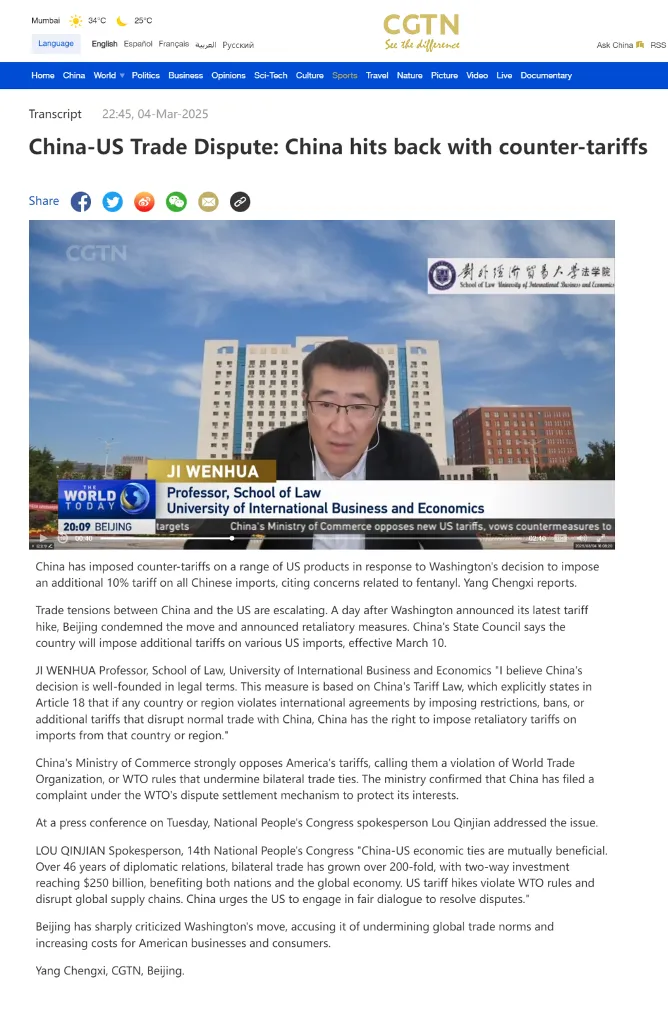 2025年3月4日,央视中国国际电视台(CGTN)《今日世界(The World Today)》节目就中美贸易摩擦问题采访了必赢3003no1线路检测中心必赢3003no1线路检测中心纪文华教授。