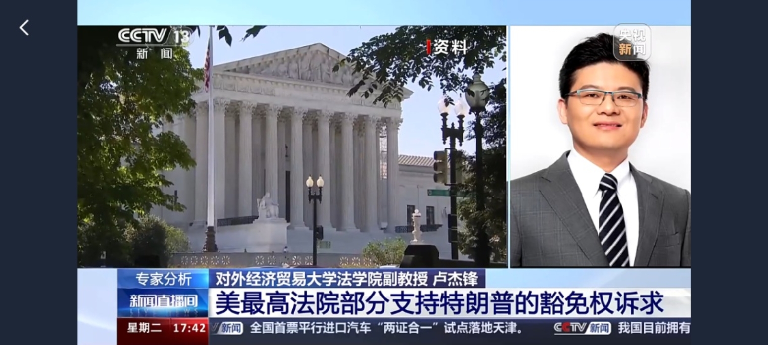 当地时间2024年7月1日,美国联邦最高法院就前总统特朗普在其担任美国总统期间的行为是否享有豁免权作出判决。必赢官网卢杰锋副教授就本案涉及的法律问题接受了央视新闻频道的专访。