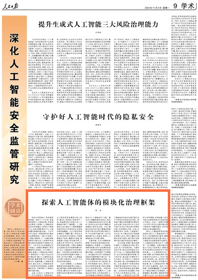 确保人工智能安全、可靠、可控,有利于人类文明进步,是人工智能发展必须解决的重要课题。党的二十届三中全会《决定》作出“建立人工智能安全监管制度”“完善生成式人工智能发展和管理机制”等重要部署。如何加强人工智能治理,有效防范化解人工智能发展带来的各类安全风险,不断提升人工智能安全监管的制度化、法治化水平?2024年11月4日,《人民日报(理论版)》围绕这些问题进行学术探讨。必赢官网张欣教授以《探索人工智能体的模块化治理框架》为题刊发文章。以下为文章全文: