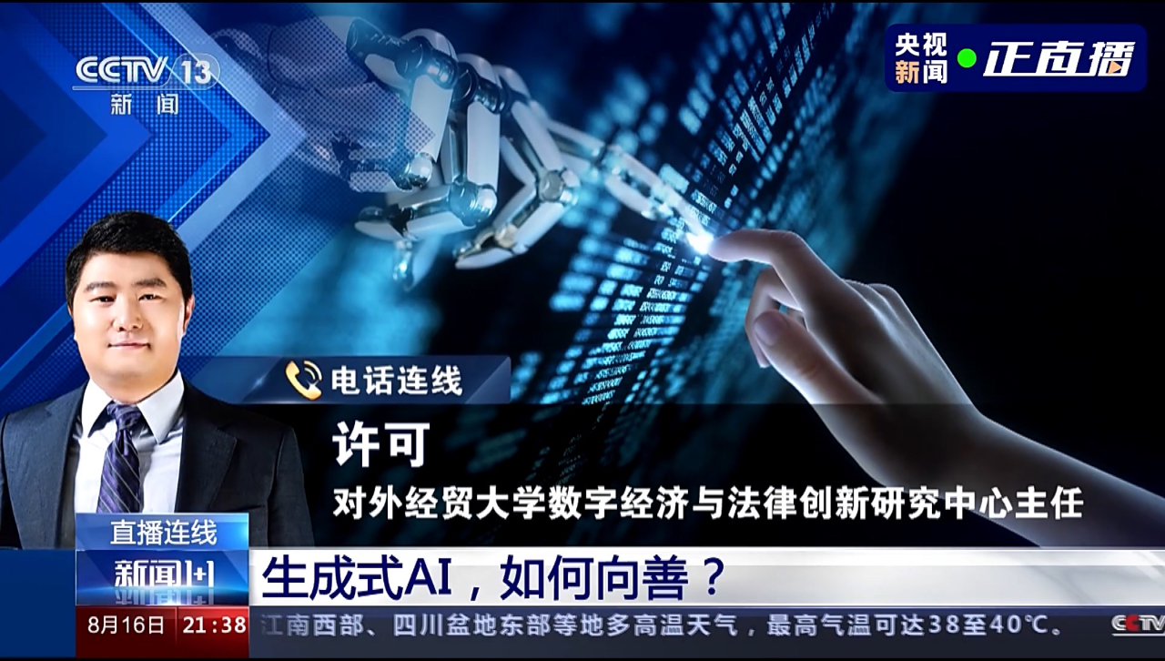 【编者按】 8月15日,国家网信办等七部门发布的《生成式人工智能服务管理暂行办法》正式实施。如何看待这样一份文件的实施?采取有效措施鼓励生成式人工智能创新发展,对生成式人工智能服务实行包容审慎和分类分级监管,将给刚起步的生成式人工智能带来怎样的影响? 以法治引领人工智能“避恶向善” ,为人工智能发展系上“安全带” ,大数据大算力大模型在带来巨大便利的同时,它的安全风险又该如何规避? 近日,央视新闻频道记者专题连线了对外经贸大学必赢3003no1线路检测中心数字经济与法律创新研究中心许可主任。