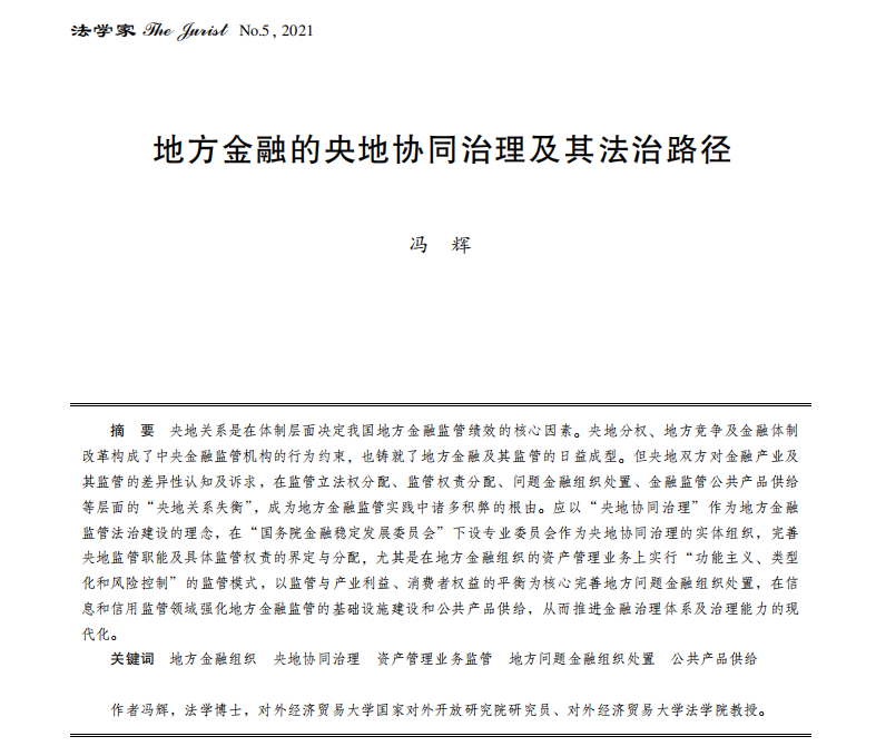 一是央地“协同”。改革开放以来的央地分权与地方竞争,逐步孕育出经济与社会治理中的央地协同共识。央地协同是一个实践中形成并发展的现象,而非成文法上的严格界定。所以在《宪法》《地方各级人民代表大会和地方各级人民政府组织法》《立法法》等侧重宏观政制建构而非具体事务性问题解决的实体法层面,往往无法直接找到央地协同、分权和竞争的法律规范依据。相反,在《分税制决定》《2017意见》等更具回应性和具体性的公共政策,以及“一行两会”针对具体金融监管事务颁布的规范性文件中,能够寻得大量体现央地协同理念的原则、机制及举措,或者是在集权管控引发的后果反思中发现央地协同的必要和路径。央地关系是一个语境化的概念,不能局限于行政法上的纵向管理关系;央地协同也不能曲解为“纵向协同”,从而人为地给具体事务治理中的央地协同路径制造理论障碍。从实践来看,央地协同的困难并不在于政制或体制,而在于如何在具体的事务治理中整合中央与地方的不同诉求并形成规则。所以关键在于构建协同的实体组织并完善相应的制度安排,在实践中积累央地协同的“地方性知识”,从而以法治的方式实现央地协同的制度化。