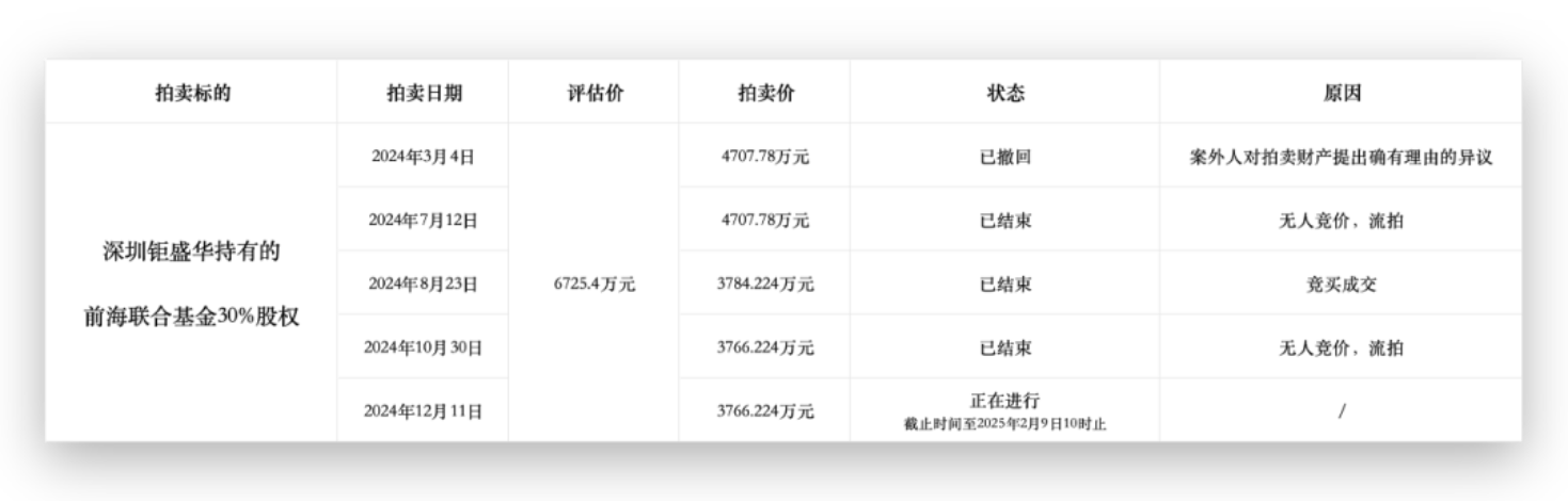 同样的标的物,此前,深圳钜盛华持有的前海联合基金30%股权,在今年已历经四次拍卖。按起拍时间先后顺序,分别为3月4日、7月12日、8月23日、10月30日,拍卖价格分别对应4707.78万元、4707.78万元、3784.22万元、3766.22万元。