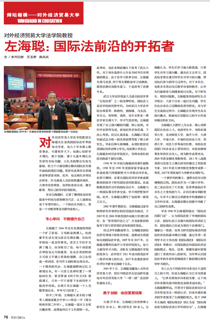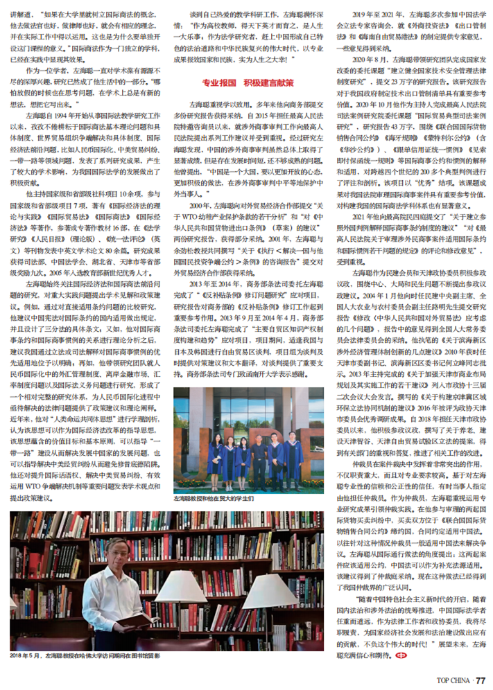 “随着中国特色社会主义新时代的开启,随着国内法治和涉外法治的统筹推进,中国国际法学者任重而道远,作为法律工作者和政协委员,我将尽职履责,为国家经济社会发展和法治建设做出应有的贡献,不负这个伟大的时代!”展望未来,左海聪充满信心和期待。