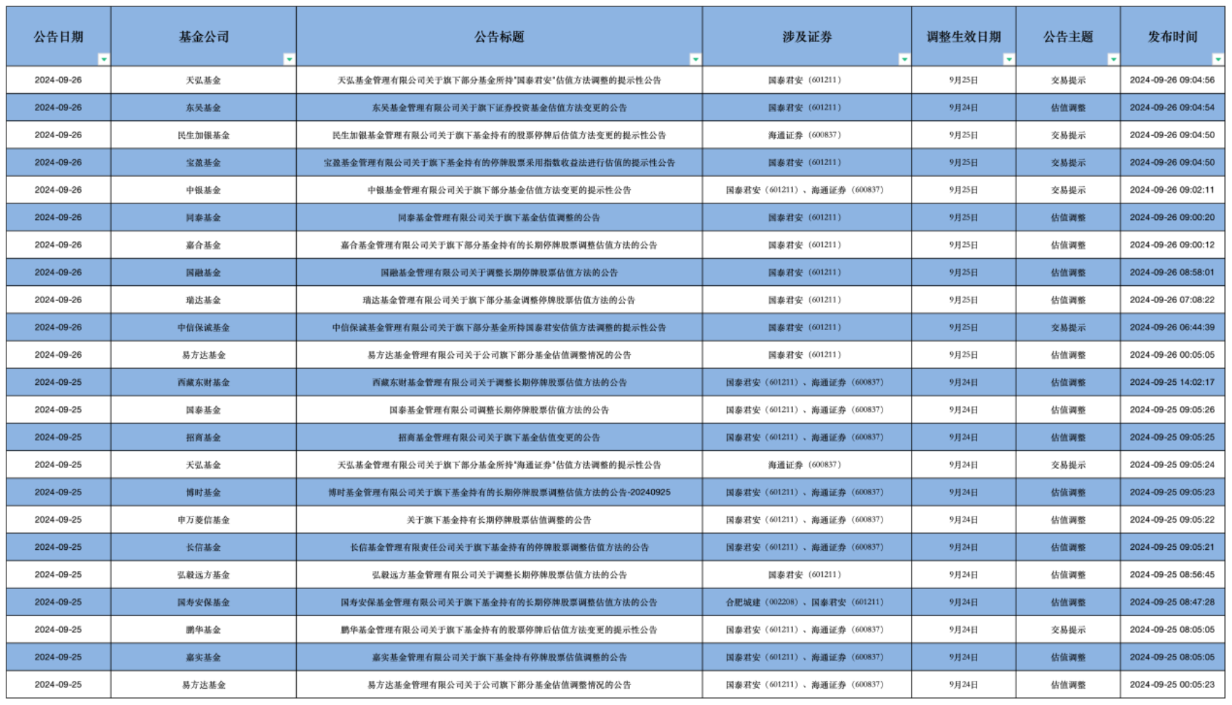 例如,9月26日,中银基金公告,根据中国证监会2017年9月5日下发的〔2017〕13号公告《中国证监会关于证券投资基金估值业务的指导意见》及本公司长期停牌股票的估值政策和程序,经与托管行协商一致,本公司决定自2024年9月25日起,对旗下基金(ETF基金除外)所持有的股票国泰君安(601211)、海通证券(600837)的估值进行调整,采用“指数收益法”进行估值。