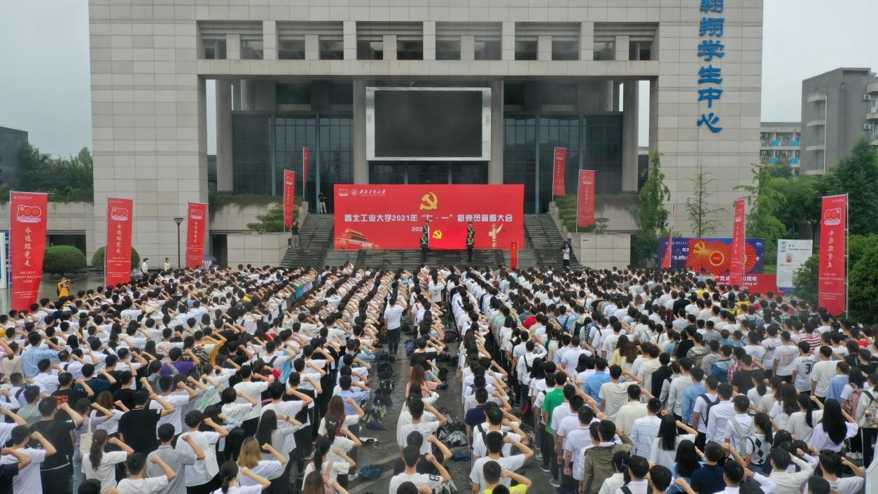 7月1日上午,西北工业大学新发展的党员在领誓人带领下,紧握右拳面对鲜红的党旗庄严宣誓。